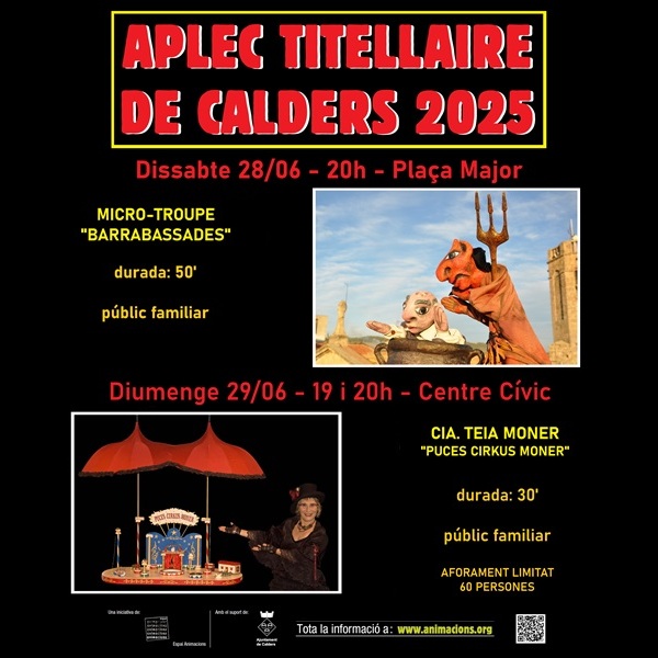 El tercer Aplec Titellaire de Calders, organitzat per l’Espai Animacions (Centre d’Iniciatives Titellaires) i l’Ajuntament de Calders, es consolida com a petita alternativa al Festival de Titelles del Moianès desaparegut el 2023, i segueix la iniciativa del primer Aplec, celebrat el 2015, per inaugurar l’Espai Animacions de Calders, seu de la companyia Rocamora Teatre.